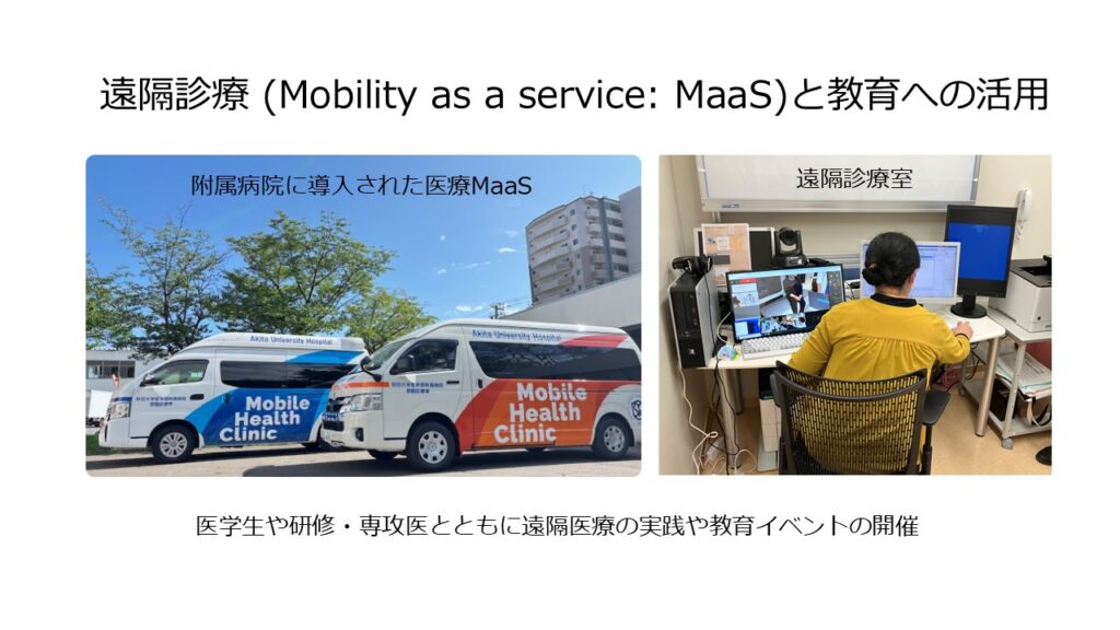 • 男鹿みなと市民病院や市立角館総合病院での診療指導、ビデオレビューを用いた診療省察、指導医と専攻医が週に1回秋田大学に集合するHalf day backによる振り返りなどを行い、研修プログラムを改善しています。医療アクセスの課題に対応するため、医療機器を搭載して遠隔医療を可能にする医療MaaSが大学に導入され、男鹿市での実証検討が始まりました。仙北市も医療MaaSを導入し、医療DXを強力に推進しています。寄附講座では医療MaaSを活用した総合診療の実践的な教育プログラムを構築していきます。