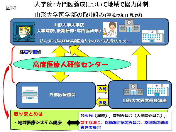 III.医師育成 山形大学医学部における医師育成の根本理念である山形県の医療に貢献しつつ同時に日本全体の医療に貢献する有為な人材を輩出するために上記の蔵王協議会が大きな役割を果たしている。医師の育成に関しては卒前・卒後の教育に一貫して関与する仕組みが構築されている。これが地域における「知的環境整備」である。 (1)卒前教育:卒前からの優れた臨床医の育成臨床実習は病院の実際の医療チームの中で行う「Student doctor」制度を全国に先駆けて考案し(平成22年度嘉山孝正医学部長(当時))、遂行している。卒前の臨床実習を地域病院と連携して行っており、実習期間72週を平成26年より開始する。 (2)卒後教育:上記の医療ネットワークを、卒前教育と連続的に行うために大学医局を中心として教育制度の確立、卒後の医師育成のプロセスを(初期臨床研修、専門医研修、生涯教育)総合的におこなうために蔵王協議会とならんで山形大学医学部総合医学教育センター(詳細な説明は後述)をおいている。山形大学医学部総合医学教育センター(図2.http://www.id.yamagata-u.ac.jp/yufm_gmec/index.html)では、医師が医療のニーズに合わせた教育がタイムリーに受けられるように、山形大学医学部卒後臨床研修センターと協力しながら、卒前、卒後の医師育成プログラムを多様に準備して、山形大学医学部附属病院の全面的な協力のもとに実行している。これにより、初期臨床研修において、蔵王協議会の医療機関とのたすきがけの研修プログラムをほとんどの研修医がとっているが、大学病院と地域の病院の両方で研修がうけられ、将来の専攻分野にあわせた研修が可能となっている(87%の医師がたすきがけプログラムを採用)。さらに地域で診療を担当している医師が専門医取得などより進んだ医療の勉強をしたい、学位取得など多くの要望にこまめに応えるため、山形県寄附講座地域医療システム内に高度医療人研修センターを設置した(平成22年)。当センターは総合医学教育センターと共同で、これまで山形大学医学部が独自に行ってきた東北がんEBM人材育成・普及推進事業等と連携して地域医療を担うスペシャリストの養成を目指している。ちなみに東北がんEBM人材育成・普及推進事業は、e-learningのシステムを活用することにより、最新のがん診療の情報を東北全体にわたり地域の医師に提供し、さらには多くのがん専門医の育成やがん治療に貢献する医師、医療スタッフの育成を行っている、全国の医学部初の試みである。(http://www.id.yamagata-u.ac.jp/Tebm/index.html)