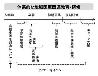定員増にあわせて、平成20年度に地域医療学講座を設置(平成22年度に地域医療推進学講座に変更)し、以下のような体系的な地域医療関連教育・研修の基盤作りを行った。