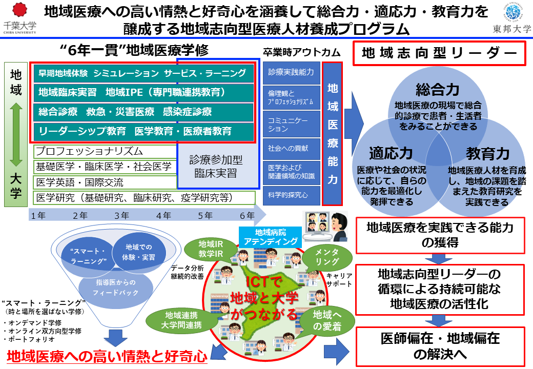 2022年(令和4年)度の研究拠点形成費等補助金(ポストコロナ時代の医療人材養成拠点形成事業)に千葉大学と東邦大学の「地域医療への高い情熱と好奇心を涵養して総合力・適応力・教育力を醸成する地域志向型医療人材養成プログラム」が採択された。同プログラムは、医師少数県である千葉県において、学生や医療者の地域医療に対する高い情熱と好奇心を涵養し、地域における医療ニーズの変化や予測困難な課題発生に対応できる総合力・適応力・教育力を有する地域志向型リーダーの育成を目的としている。