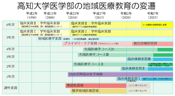 1. 高知大学医学部の役割 昭和51年に前身の高知医科大学の開学以来、高知大学医学部は特定機能病院である医学部附属病院の運営、県内唯一の医育機関として多くの卒業生を輩出することで、県内の地域医療に大きな役割を担ってきた。 2. 地域医療構想と医学教育 地域医療構想は今後の人口減少・高齢化に伴う医療ニーズの変化を踏まえ、質の高い医療を効率的に提供できる体制の構築を目指して推進されている。各医療機関は構想区域におけるそれぞれの担うべき医療の役割を明確にし、目指すべき地域の医療提供体制に近づけるように地域医療構想調整会議で継続的に調整をおこなっていくこととなっている。医療資源が有限であり、社会保障費の増大するなか、医療提供体制に効率性を求めるのは必定である。鍵となるのは医療の機能分化と連携であり、医療機能別の病床数の綱引きではなく地域包括ケアシステムの構築が重要であろう。 3. 高知大学の取り組み 前身の旧高知医科大学開学当時から、医学部附属病院だけでなく、関連教育病院である高知県立中央病院(現在の高知県・高知市病院企業団立高知医療センター)で3週間の臨床実習をおこなってきた。平成4年度からは、地域医療学実習として、へき地医療機関、保健所、福祉施設等で1週間の実習をおこなってきた。さらに、平成18年度からは、プライマリ・ケア実習(現在は総合診療部実習)として、1週間の市中のクリニック等での実習を開始し、平成20年度からは、EME初期臨床医学体験(1年生)として、半日×15回にわたるプライマリ・ケア医療機関、福祉施設、等での実習を開始した。平成21年度からは、関連教育病院である高知医療センターに限定せず、県内の臨床研修指定病院でもクリニカル・クラークシップを可能としている。さらに令和5年度からは6年生の選択制のクリニカル・クラークシップをそれまでの1週単位から3~4週の比較的長期の実習に変更した。また、正課外でも、平成19年度から中山間地において1泊2日でおこなう家庭医道場、平成21年度から地域枠学生を対象とした幡多地域医療道場を開始するなど、地域に学生が赴く機会を段階的に増やしてきている。